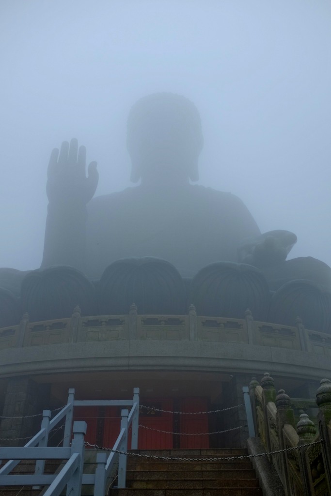 Am nächsten Tag beschließen wir dem geschäftigen Treiben der Innenstadt ein wenig zu entfliehen und nehmen die Fähre auf die Insel Lantau. Im Hafen angekommen erwartet uns ein gemütliches Fischerdorf. Zahlreiche Fischerfamilien bieten ihre frischesten Fänge, getrocknete Krabben, Muscheln und Algen an. Es duftet nach Meer. Wir schlendern durch die verwinkelten Gassen und genießen die entspannte Atmosphäre. Mit dem Bus fahren wir zur Attraktion der Insel: Dem Tian Tan Buddha. Mit seinen 34 Metern thront er im Lotus-Sitz über der Insel und verspricht Glück für all jene, die ihm einen Besuch abstatten. Langsam steigen wir die 268 Treppenstufen zu ihm empor und sind beeindruckt von seiner Größe. Der versprochene schöne Ausblick bleibt uns jedoch leider verwehrt, denn der Regen der letzten Nacht hat die Landschaft in dicken Nebel gehüllt. Zur Entschädigung gönnen wir uns verschiedene Dim Sum - Köstlichkeiten im vegetarischen Restaurant des benachbarten Klosters.