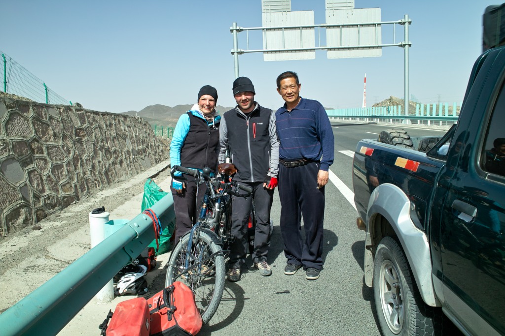 Wir kämpfen! Der Gegenwind ist nah am Limit und wir kriechen mit 8 Km/h auf der Ebene dahin. Wie aus dem Nichts fährt ein Pickup neben uns heran und ein freundliches Gesicht lehnt sich aus dem Fenster. „Wohin fahrt ihr?“ ruft der Mann. „Nach Guazhou.“ antworten wir. „Das passt. Steigt ein! Wir nehmen euch ein Stück mit.“ entgegnet er. Das passt in der Tat, denn so kann es nicht weiter gehen. Es fehlt nicht mehr viel und wir können noch nicht mal mehr schieben. Schnell laden wir alles auf und steigen ein. Herr Jin und seine beiden Kollegen reparieren Bagger und sind im Augenblick auf dem Weg in die Nähe Guazhous, erklären sie uns. Herr Jin selbst ist begeistertet Motorradfahrer und hat selbst schon fast ganz China auf seinem Zweirad erkundet. Unser Vorhaben quer durch China zu fahren imponiert und begeistert ihn daher. Wir sind so erleichtert und bedanken uns unentwegt. „Es ist heute einfach zu stürmisch um zu fahren.“ erklären wir. „Stürmisch? Heute? Nein, heute geht es doch noch.“ entgegnet man uns, „Wusstet ihr denn nicht, dass Guazhou auch der ‚Windmund‘ Chinas genannt wird?“ „Äh, nein!“ Das war uns neu. Aber in der Tat kennt man die 100.000 Einwohner Stadt Guazhou in China vor allem für ihre andauernden Sandstürme und den gewaltigen 400 MW Windpark.